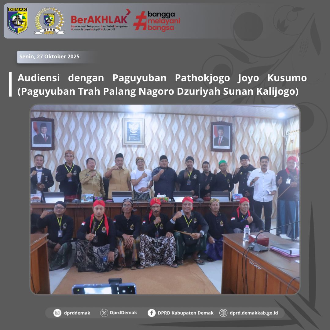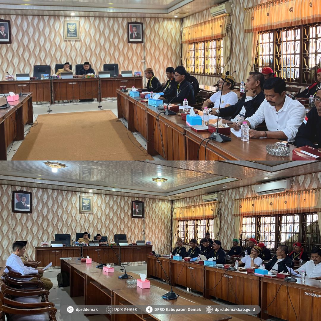DEMAK – Dewan Perwakilan Rakyat Daerah (DPRD) Kabupaten Demak menerima audiensi dari Paguyuban Pathokjogo Joyo Kusumo atau Paguyuban Trah Palang Nagoro Dzuriyah Sunan Kalijaga, Senin (27/10/2025), bertempat di Ruang Transit Pimpinan DPRD Kabupaten Demak.
